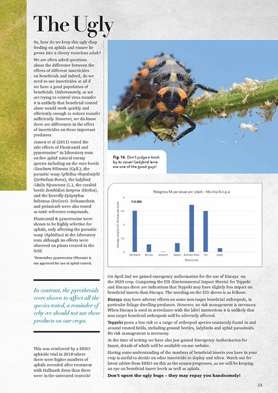 Monitoring sites include both CruiserSB and untreated crops. Winged and wingless aphid numbers are expected to increase throughout May and early June, especially on non-Cruiser treated crops. Where the threshold of one green wingless aphid per four plants (5 or more wingless aphids per 20 plants) is exceeded on the monitoring sites, growers with crops in the area are encouraged to check their own crops with some urgency and where required apply the appropriate foliar insecticide. In addition, in some crops, particularly with small plants present, the persistence of foliar insecticides can be relatively short, so growers are encouraged to continue monitoring and where available some may need to use all three allotted insecticides before the onset of mature plant resistance.