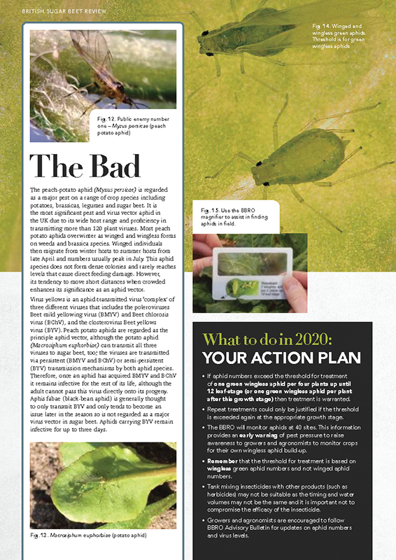 From the 3rd week in April until early July, approx. 45 sites are closely monitored, twice a week for green wingless aphids on 20 plants. In addition, at the BBRO managed sites, yellow water pans are also deployed, and samples taken twice a week for laboratory analysis to confirm numbers of winged M. persicae and Macrosiphum euphorbiae, the primary vectors of virus yellows.
