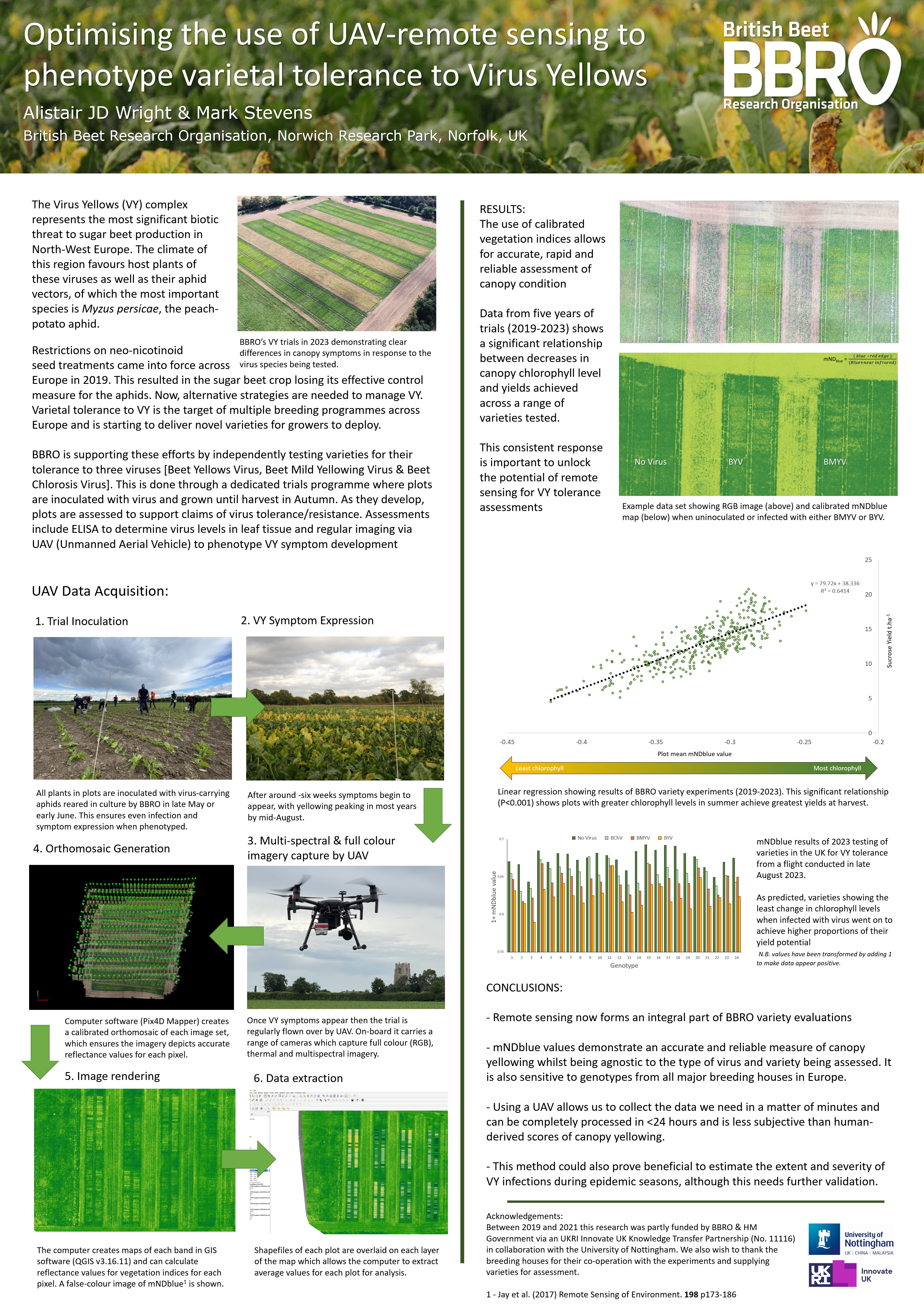 It is hoped that VY resistant varieties will be available for evaluation from circa 2023 and is the focus or renewed collaboration between breeders and the BBRO (e.g. directly or via the current InnovateUK project). However, nothing is known about the susceptibility to virus yellows of current varieties and whether there are differential responses to virus infection. If neonicotinoid seed treatments are withdrawn during 2018 understanding any differential responses between current varieties will be crucial information for growers and it will also provide up to date information on the current impact of BMYV and BYV on yield too.