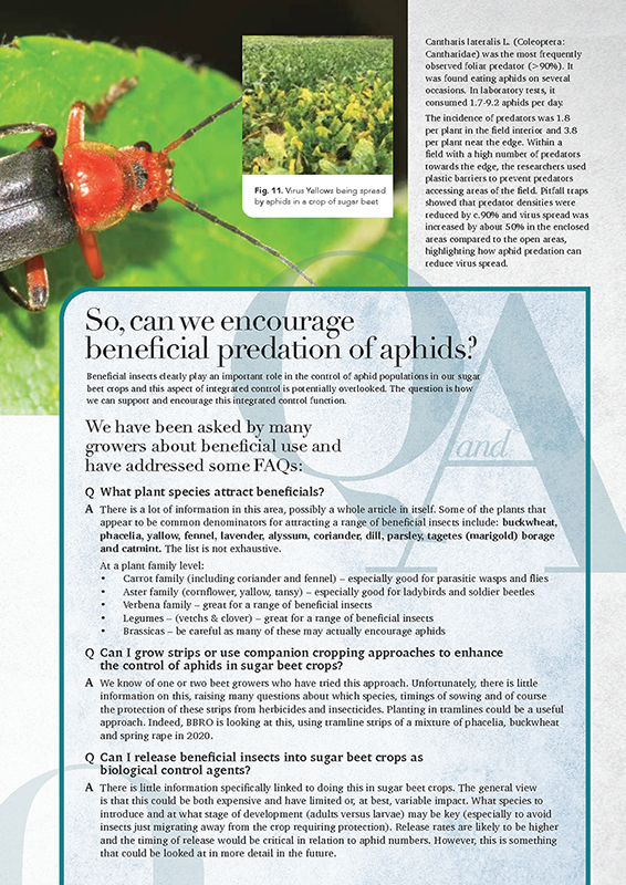 From the 3rd week in April until early July, approx. 45 sites are closely monitored, twice a week for green wingless aphids on 20 plants. In addition, at the BBRO managed sites, yellow water pans are also deployed, and samples taken twice a week for laboratory analysis to confirm numbers of winged M. persicae and Macrosiphum euphorbiae, the primary vectors of virus yellows.